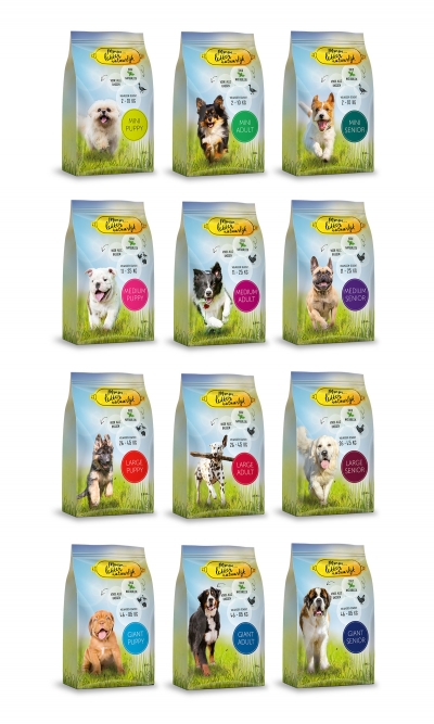 Het logo van Mmm... Lekker Natuurlijk is gebaseerd op hun eerste product, de worsten. Het merk is zo'n succes dat ze ook hondenbrokken gingen produceren. Ons werd gevraagd om daar ook een mooie heldere lijn verpakkingen voor te ontwerpen.